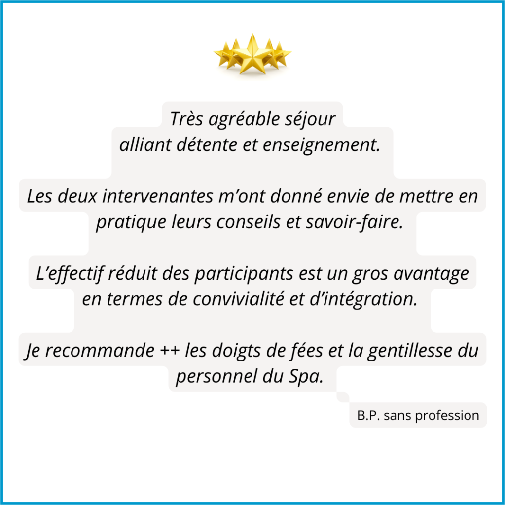 Le nombre de stagiaires est volontairement limité pour permettre une expérience unique : cours théoriques (parfois « à la carte » selon les demandes des participants et dans la limite de mes compétences) le matin et après-midi libre pour profiter des soins au spa : hammam, gommage, enveloppements d’algues, massages… Je ne connais rien de mieux pour lâcher le stress !